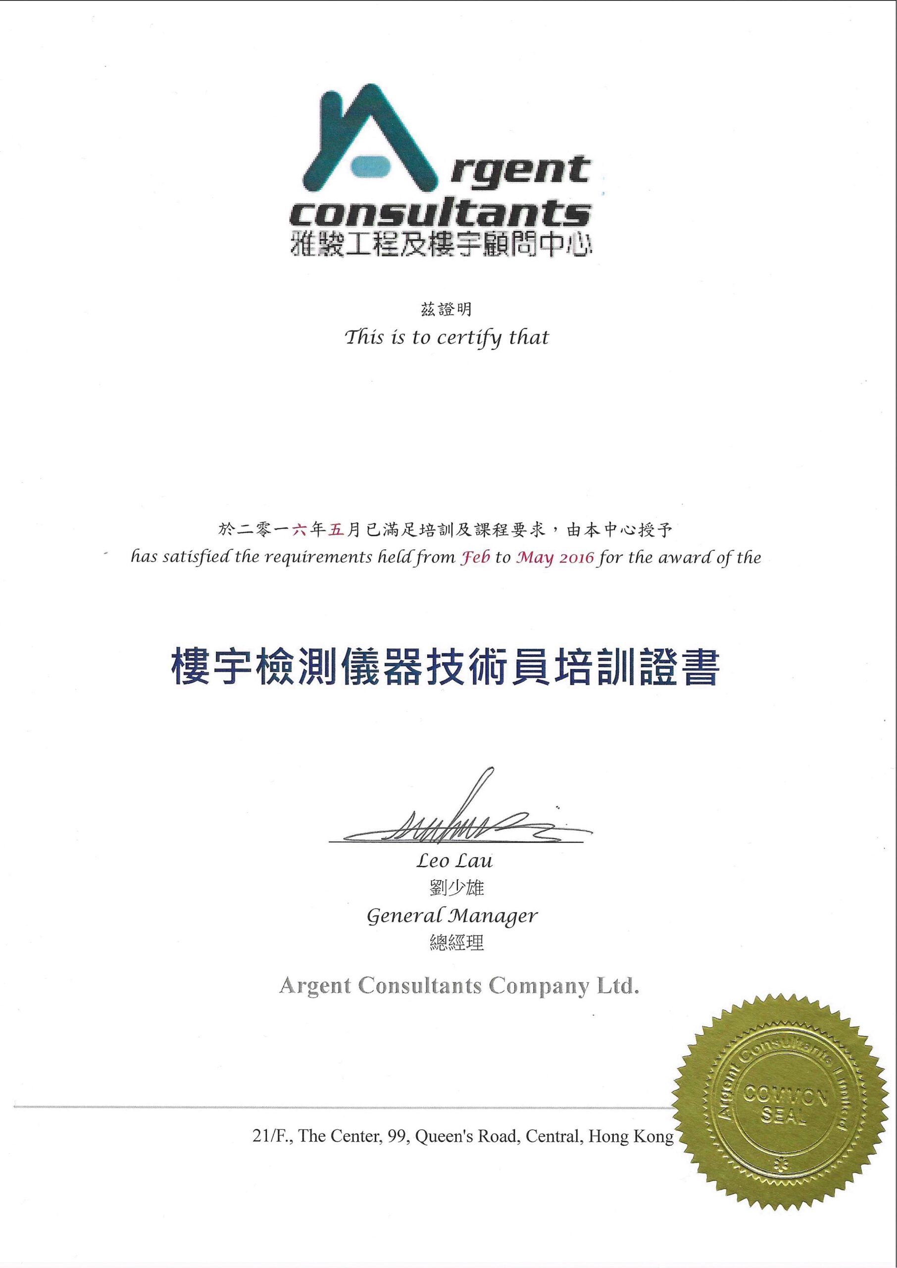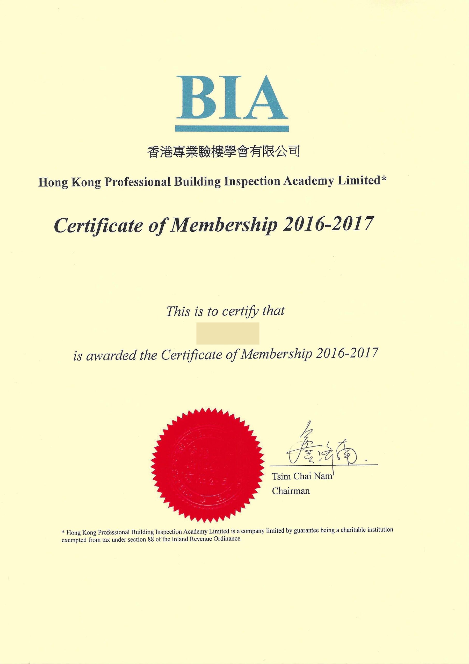 香港專業驗樓學會會員證書 Certificate of Membership – Hong Kong Professional Building Inspection Academy Limited